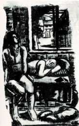 יוחנן סימון, זוג בחדרו בקיבוץ, שנות הארבעים של המאה העשרים. דיו על נייר